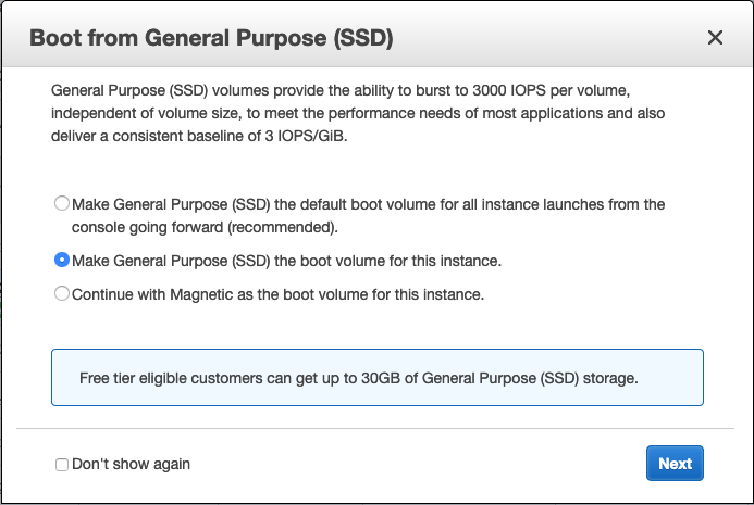 You will be prompted with a dialog similar to below asking you whether to boot from SSD. This is a good idea and is part of the free tier. It’s recommended to select, “Make General Purpose (SSD) the boot volume for this instance.” Click “Next.